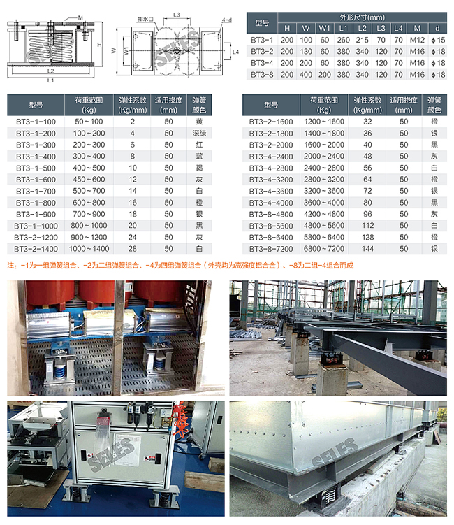 BT3型彈簧減振器撓度50mm,在額定載荷下固有頻率2.2Hz,阻尼比為0.05,工廠已對(duì)彈簧預(yù)緊壓縮60%,易于調(diào)節(jié),是積極、消極減振的理想產(chǎn)品。
